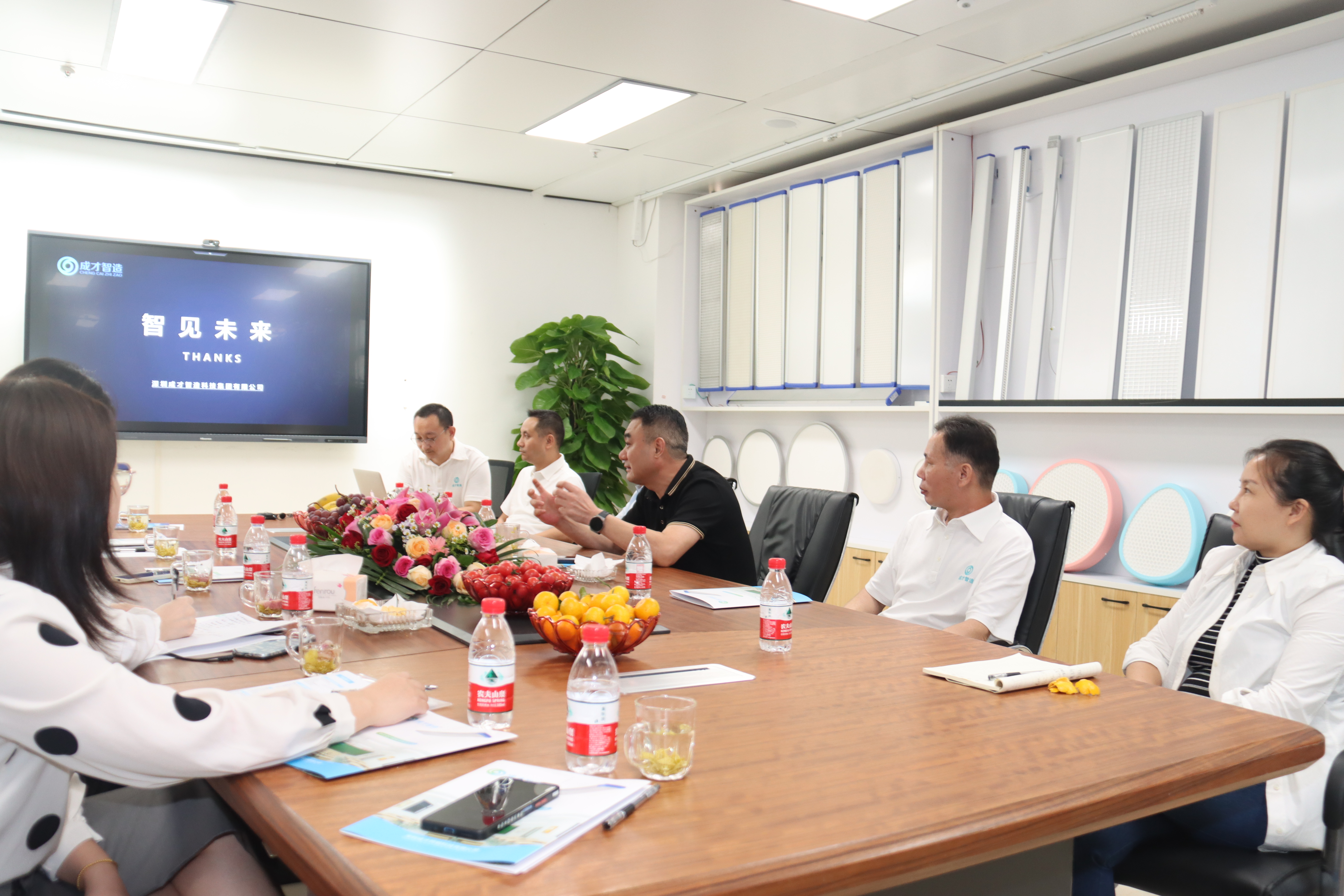 隨后,行業(yè)協(xié)會彭總和心里程各位同仁對“智慧教室”的落地情況,以及成才智造新品“智能頂”的市場前景展開了熱烈的討論。整個過程氣氛活躍,交流充分。行業(yè)協(xié)會彭總和心里程黃總對成才智造的軟硬件產(chǎn)品表示了充分的肯定,也提了很多中肯的意見,并表示雙方后續(xù)可以就合作的各項切入點和合作模式進行進一步探討。